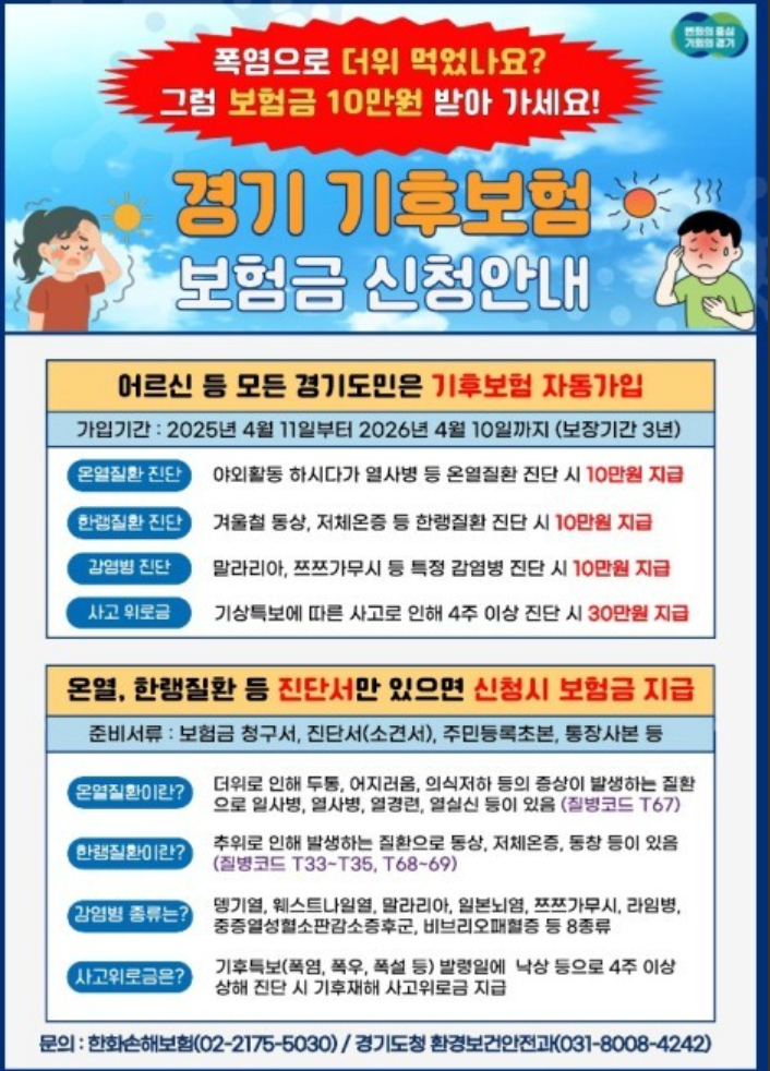 적용 범위: 경기도 기후보험(온열·한랭질환, 특정 감염병, 기후재해 상해, 취약계층 병원 교통비)