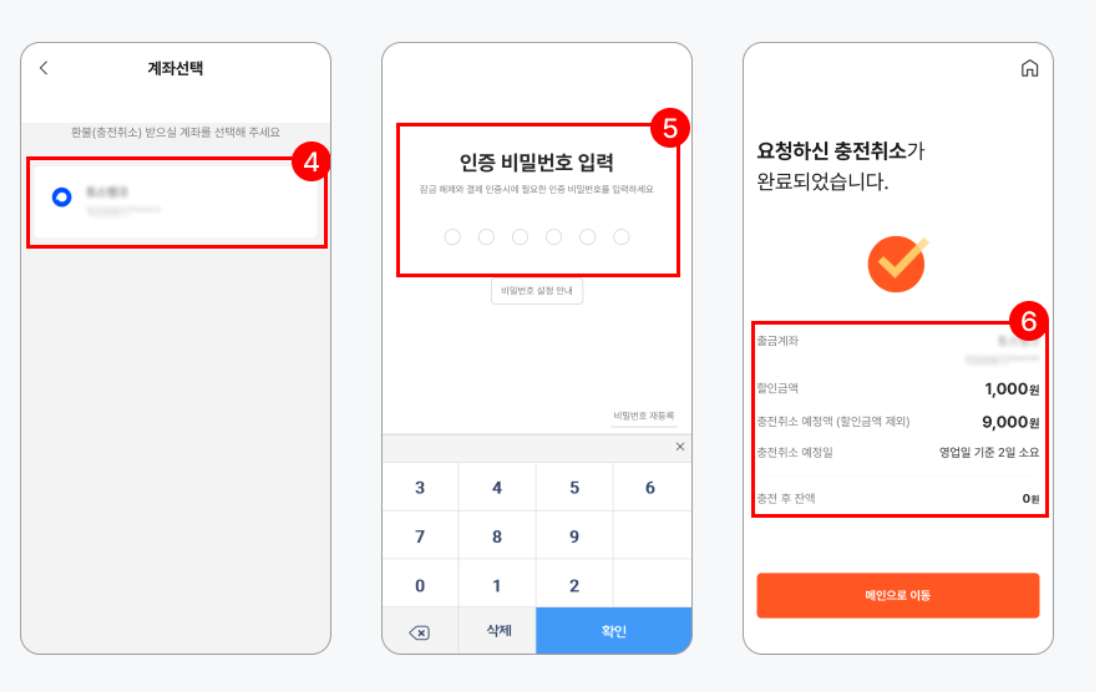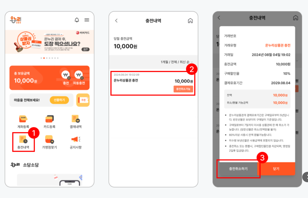 잘못 충전했을 때는 앱에서 충전취소를 진행할 수 있습니다.